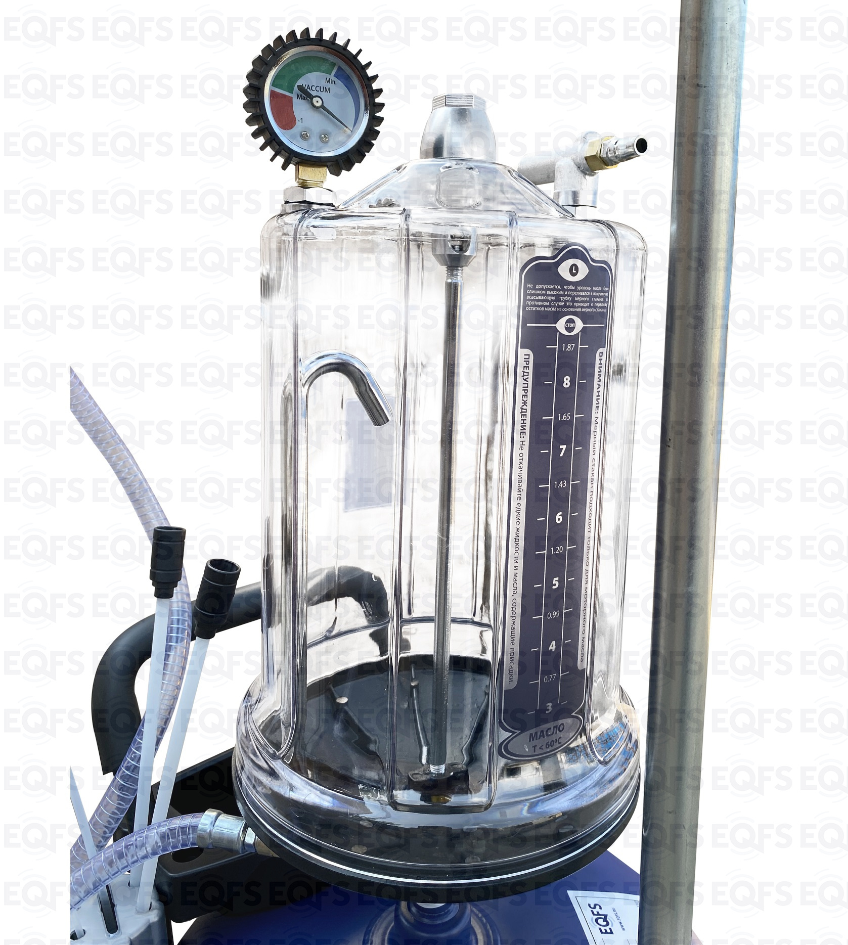 Установка для слива и откачки щупами масла и антифриза из ДВС, КПП и мостов. В комплекте: Колба с особо прочным пластиком + Сливная чаша с сеткой для улавливания мелких деталей + Щупы гибкие 5 шт. + Лоток для сливной пробки + Металлические пистолеты для откачки масла + визуальный контроль уровня отработки+ стрелочная индикация уровня разрежения в установке + Быстросъёмный штуцер для пневмолинии + Сепаратор для выхода воздуха. Вмещает 100 л. = Бак 80л + колба 10 л. + сливная воронка 10л.
