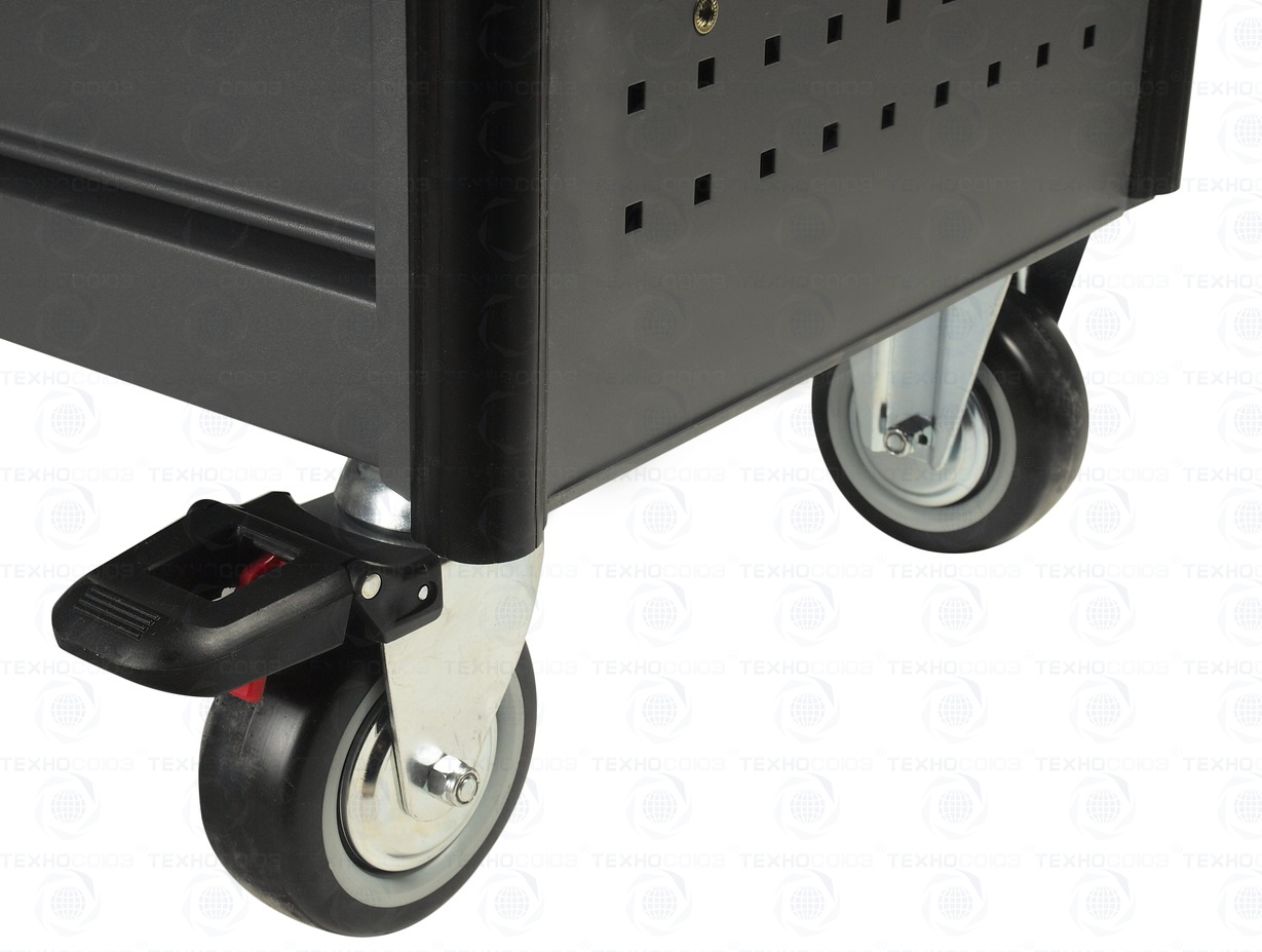 • Корпус тележки оснащен защитными бортами, что сводит к минимуму риск повреждения оборудования и нанесение травм автомеханикам во время перемещения по СТО.
