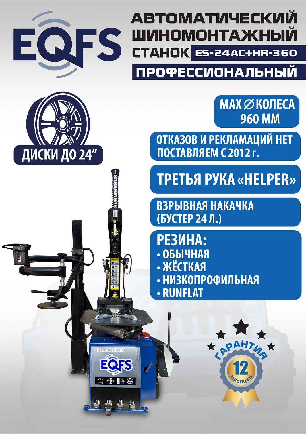 ES24AC+HR360 Станок шиномонтажный Автомат. Большой квадратный стол. Для колес от 10 до 24 дюйма. В комплекте взрывная подкачка + третья рука для работы с низкопрофильными шинами и RanFlat. Усилие отжима 2700кг, что дает возможность работать с самыми жесткими покрышками. Для шиномонтажных мастерских со средней и высокой проходимостью.