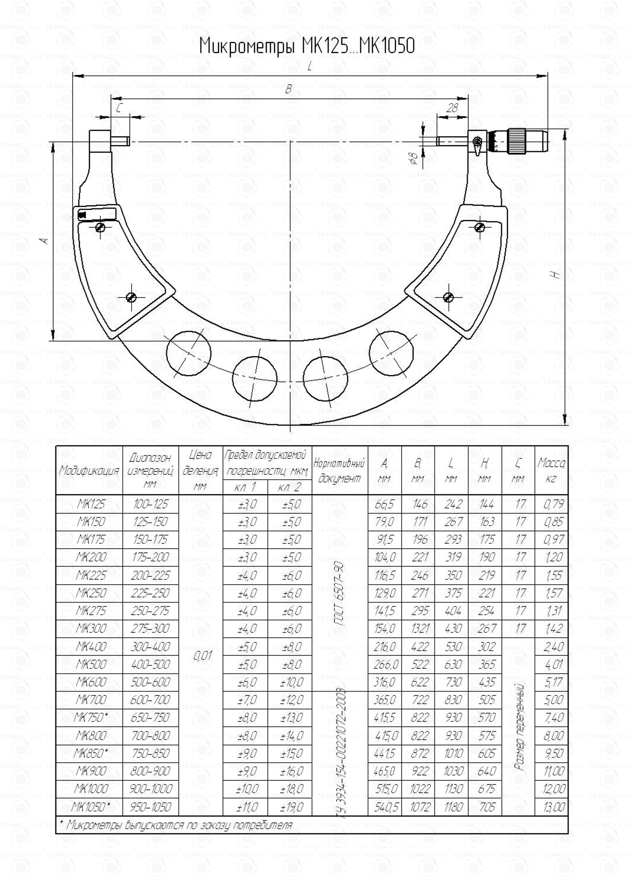 Цена деления 0,01 мм. Диапазон измерения от 900-1000 мм. Для измерения наружных размеров изделий. Измерительные поверхности микрометра оснащены твердым сплавом. Микрометры укомплектованы установочная мера 2 шт. Класса точности 1. ГОСТ 6507-90. Поставляется в двух вариантах с поверкой и без поверки!