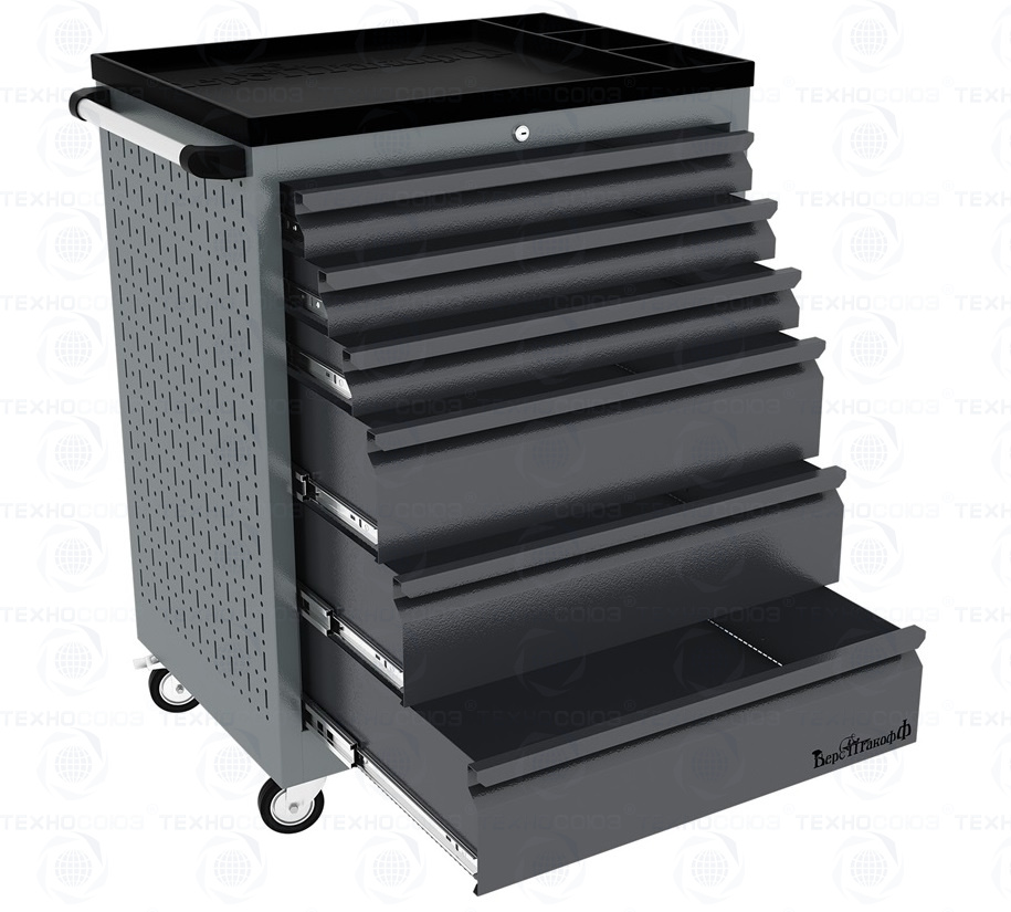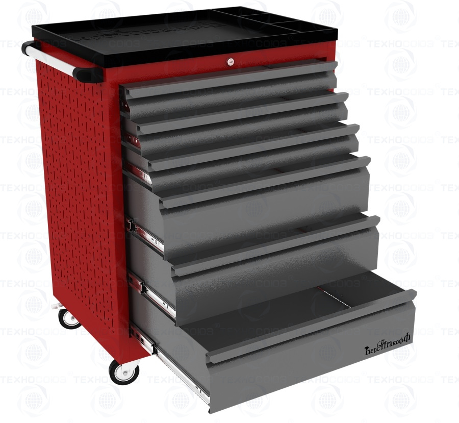 Тележки инструментальные серии PROFFI 950 предназначены для использования на предприятиях любого профиля занятых ремонтом и изготовлением различной продукции. На боковые стенки инструментальной тележки нанесена перфорация размером 25х25 мм и диаметром отверстия 8 мм, что позволяет устанавливать на них навесной инструмент или крючки. Наибольшей популярностью тележки инструментальные пользуются в сфере авторемонта и обслуживания автомобилей .Тележки имеют выдвижные ящики на шариковых телескопических направляющих полного выдвижения с фиксацией в закрытом положении, предотвращающее открывание при передвижении тележки. Ящики имеют центральный замок, который позволяет ограничить доступ посторонних лиц к содержимому ящиков. Тележка инструментальная изготовлена из высококачественного металла ведущих Российских производителей, покрашена порошковой краской производства Германии, имеет итальянскую и турецкую фурнитуру. Тележки для инструмента оснащены двумя не поворотными колесами диаметром 100 мм, одним поворотным и одним поворотным со стопором, которое фиксирует тележку и предотвращает непроизвольное скатывание.