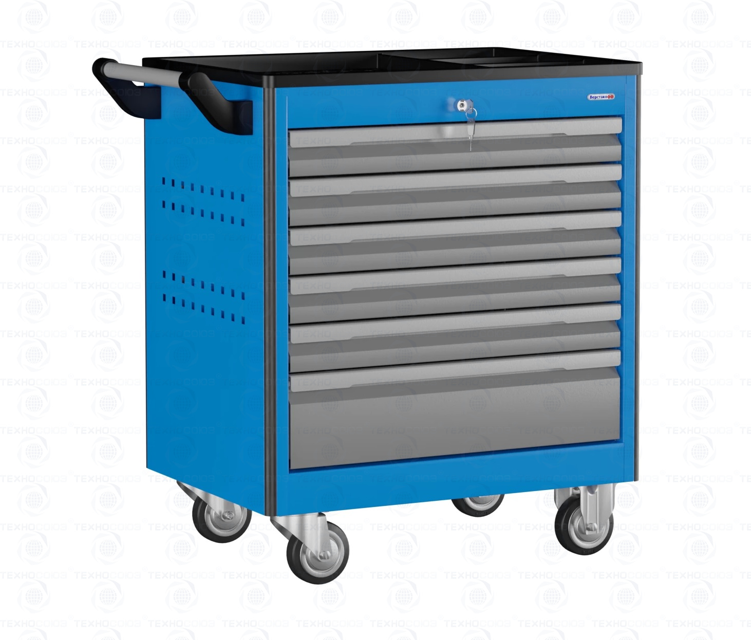 Тележка снабжена центральным замком с поворотом ригеля 180 градусов, который закрывает одновременно все ящики. Замок неподвижно и прочно закреплен на корпусе тележки. В комплекте имеется два ключа. Тяга замка подпружинена.