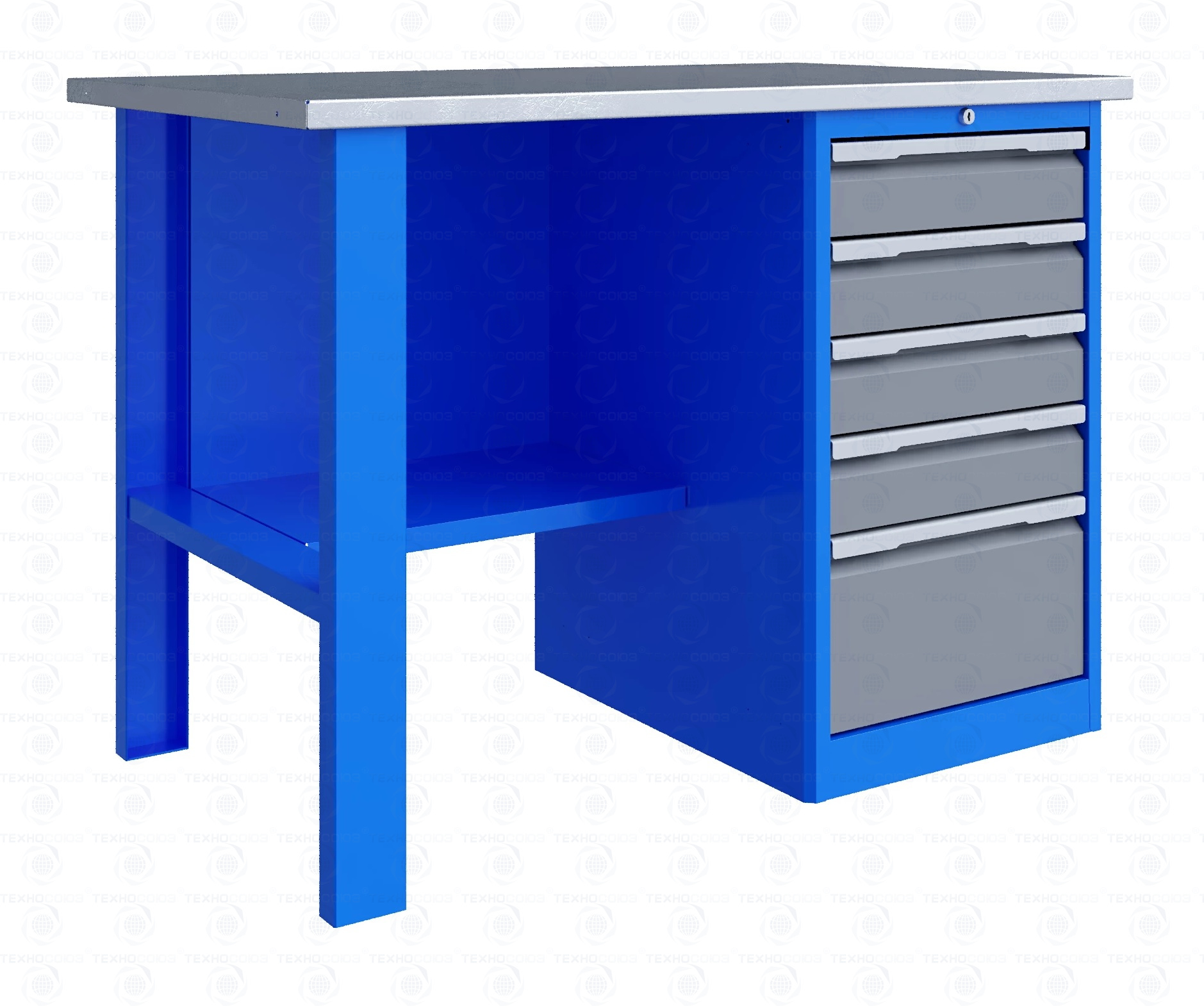 Тумба верстака - сварная. Ящики в тумбе устанавливаются на шариковых телескопических направляющих полного выдвижения. В тумбе P5 установлено четыре малых и один большой ящика. Внутренние размеры малых ящиков (ВхШхГ), не более: 103 х 397 х 520 мм. Внутренние размеры больших ящиков (ВхШхГ), не более: 222 х 397 х 520 мм. Тумбы с ящиками снабжены общим центральным замком с поворотом ригеля 180 градусов и подпружиненной тягой. В комплекте два ключа.